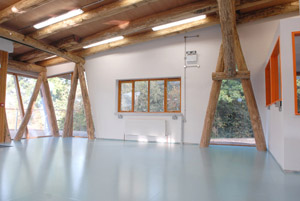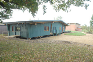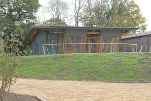The finished building sowing the simplicity of its design in the landscaped setting.